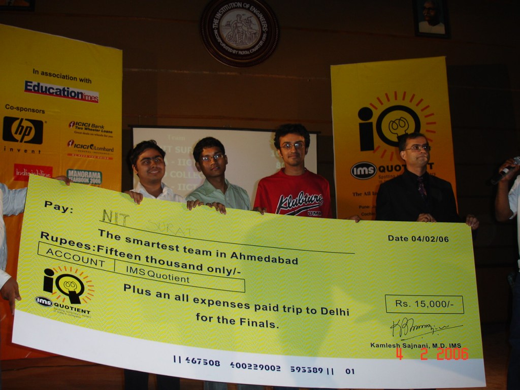 Again, I was the captain of my college quiz team that won the regional round in Ahmedabad and we made it to the national finals in Delhi. The travel to Delhi was the first time I flew in an airplane. Made lots of friends during the Delhi trip, some of whom I am in touch with even after nearly 16+ years.