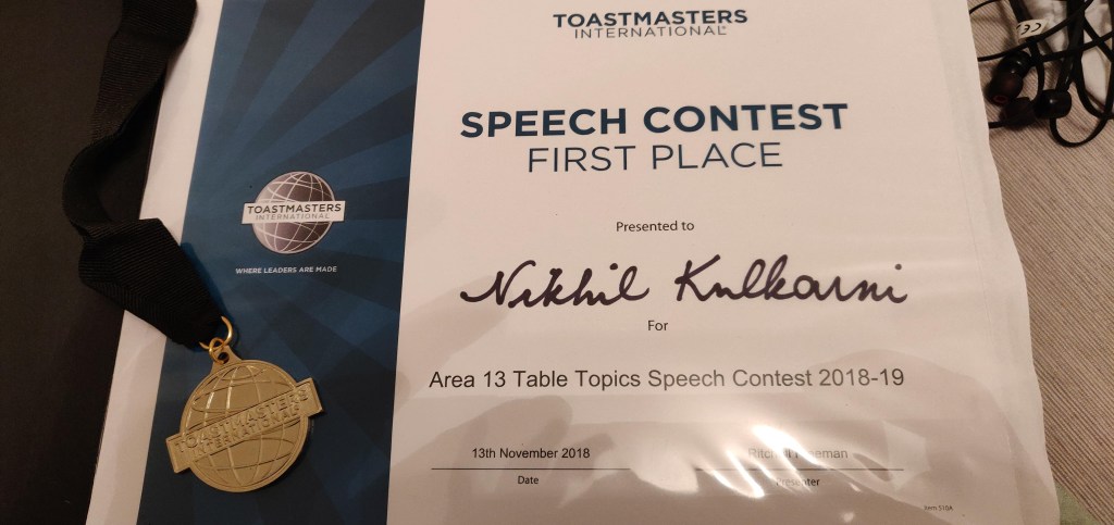 I participated in representing Area 13 to which my Toastmasters Club (Atlassian) belonged to. I had won the first place at the Area 13 level 😀
