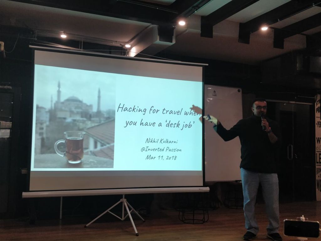 This was at a community event in Bangalore. I had done a lot of travel in the last couple of years until then and it seemed like a good opportunity to share some interesting experiences and tips with the audience. More here – https://nikhilnk.wordpress.com/2018/03/18/talk-at-inverted-passion-on-hacking-for-travel-when-you-have-a-desk-job/