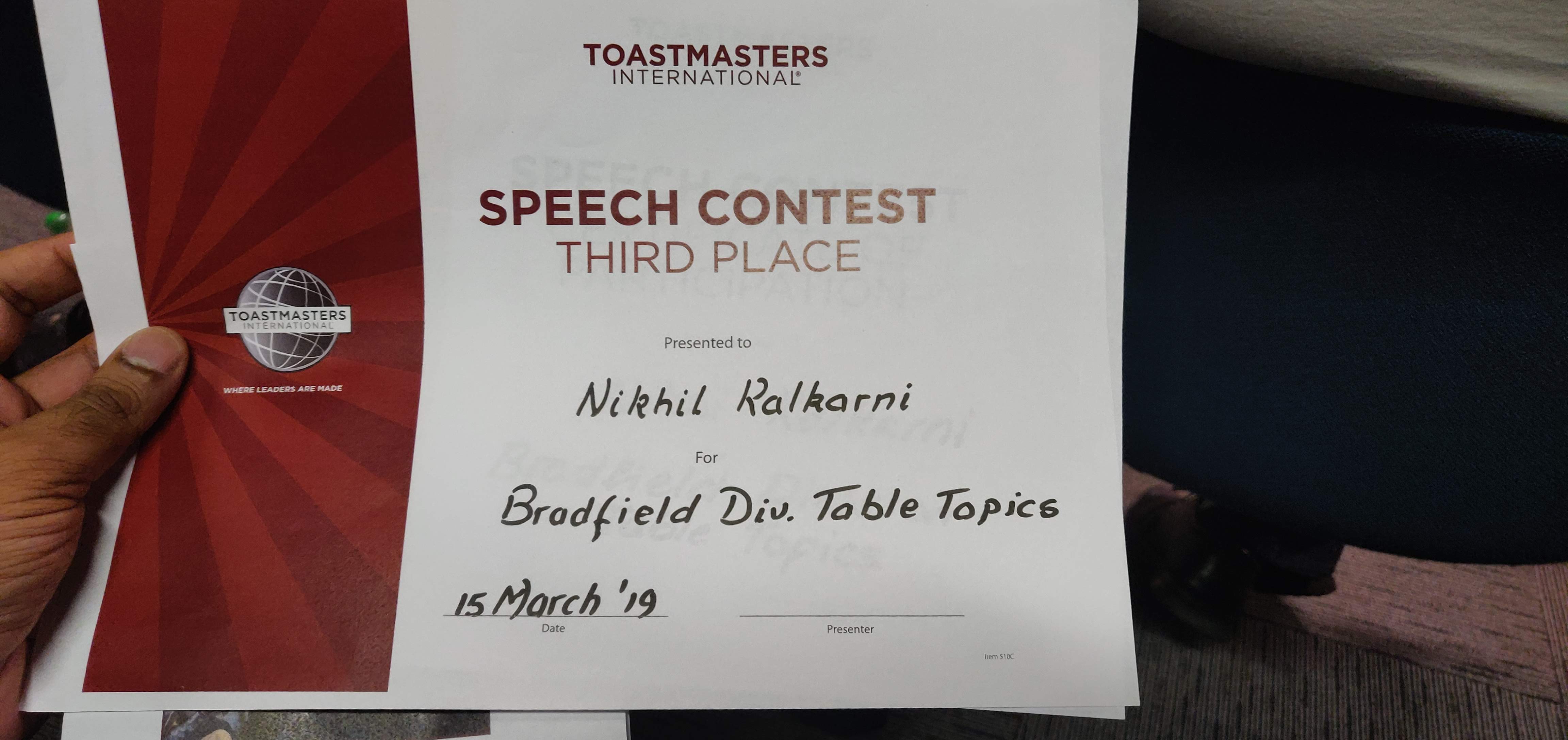 I was quite active with Toastmasters in 2019 and 2020. Once the pandemic hit, the Toastmasters meeting became just another Zoom meeting and I dropped off. Plus, things at home and work took a higher precedence. The highlight of my time at Toastmasters then was winning the third place in the Table Topics competition (‘on the spot’ topics) within the Bradfield Division.